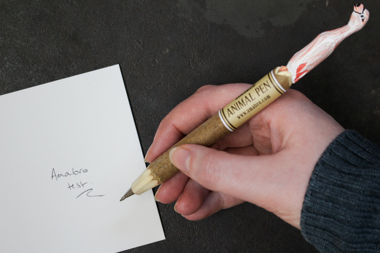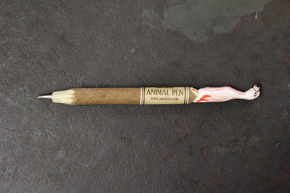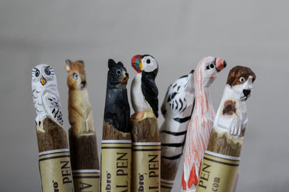 Hand-carved pens featuring birds and animals. The wood used for these pens is from Amorpha, colloquially known as Indigo Bush, which is harvested from sustainable plantations. Farmers make enclosures from this tree to prevent wild animals from destroying their farms and as soon as they are felled, more and planted. They also sell wood from felled trees on the open market to support their income further. It is a circular method to preserve both land and native animals which in turn ensures sustainable forest enclosures.