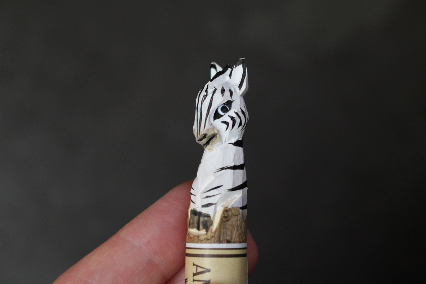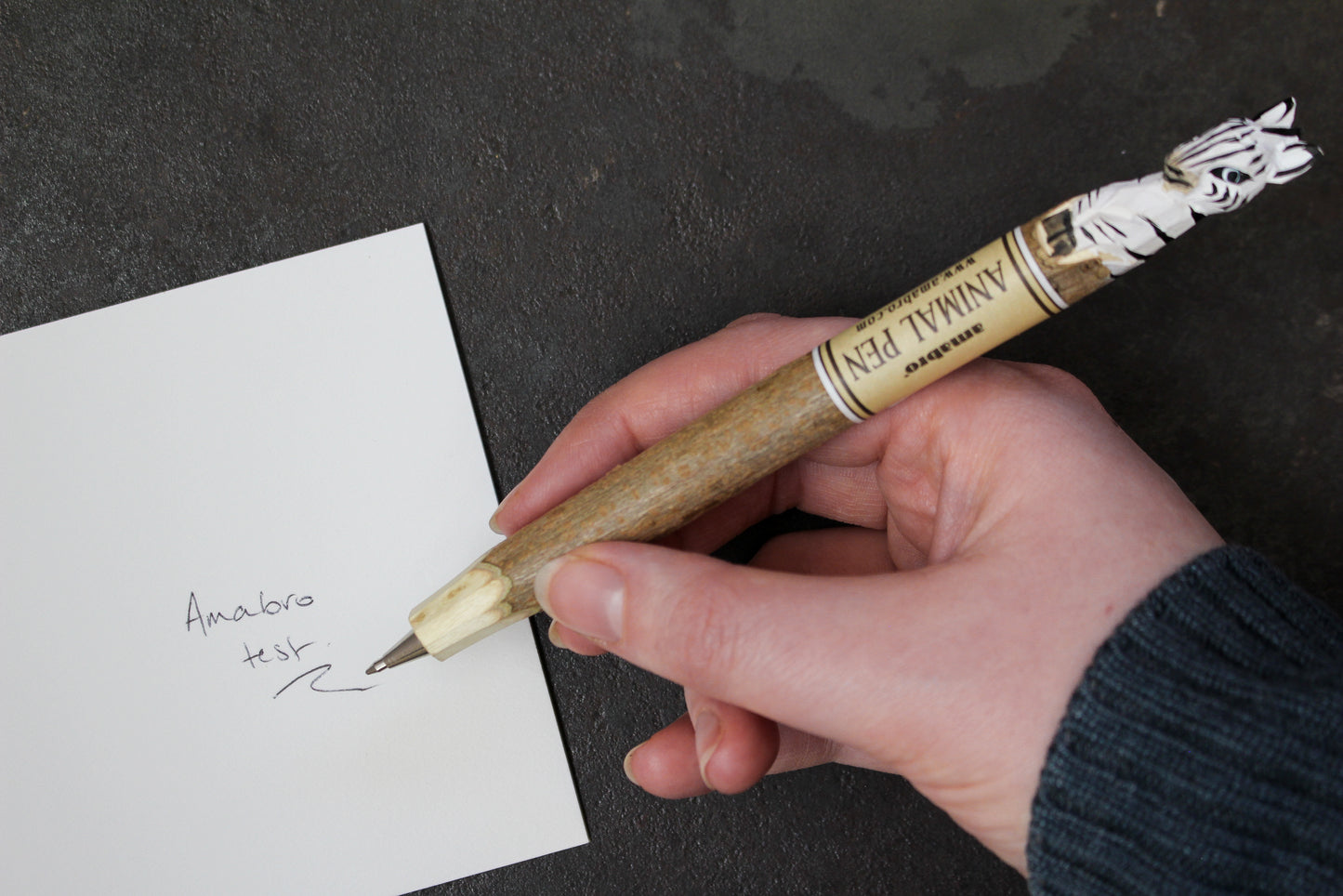 Hand-carved pens featuring birds and animals. The wood used for these pens is from Amorpha, colloquially known as Indigo Bush, which is harvested from sustainable plantations. Farmers make enclosures from this tree to prevent wild animals from destroying their farms and as soon as they are felled, more and planted. They also sell wood from felled trees on the open market to support their income further. It is a circular method to preserve both land and native animals which in turn ensures sustainable forest enclosures.