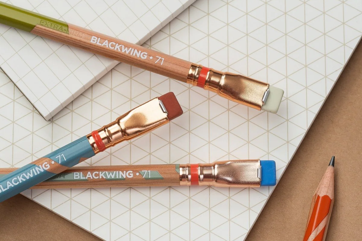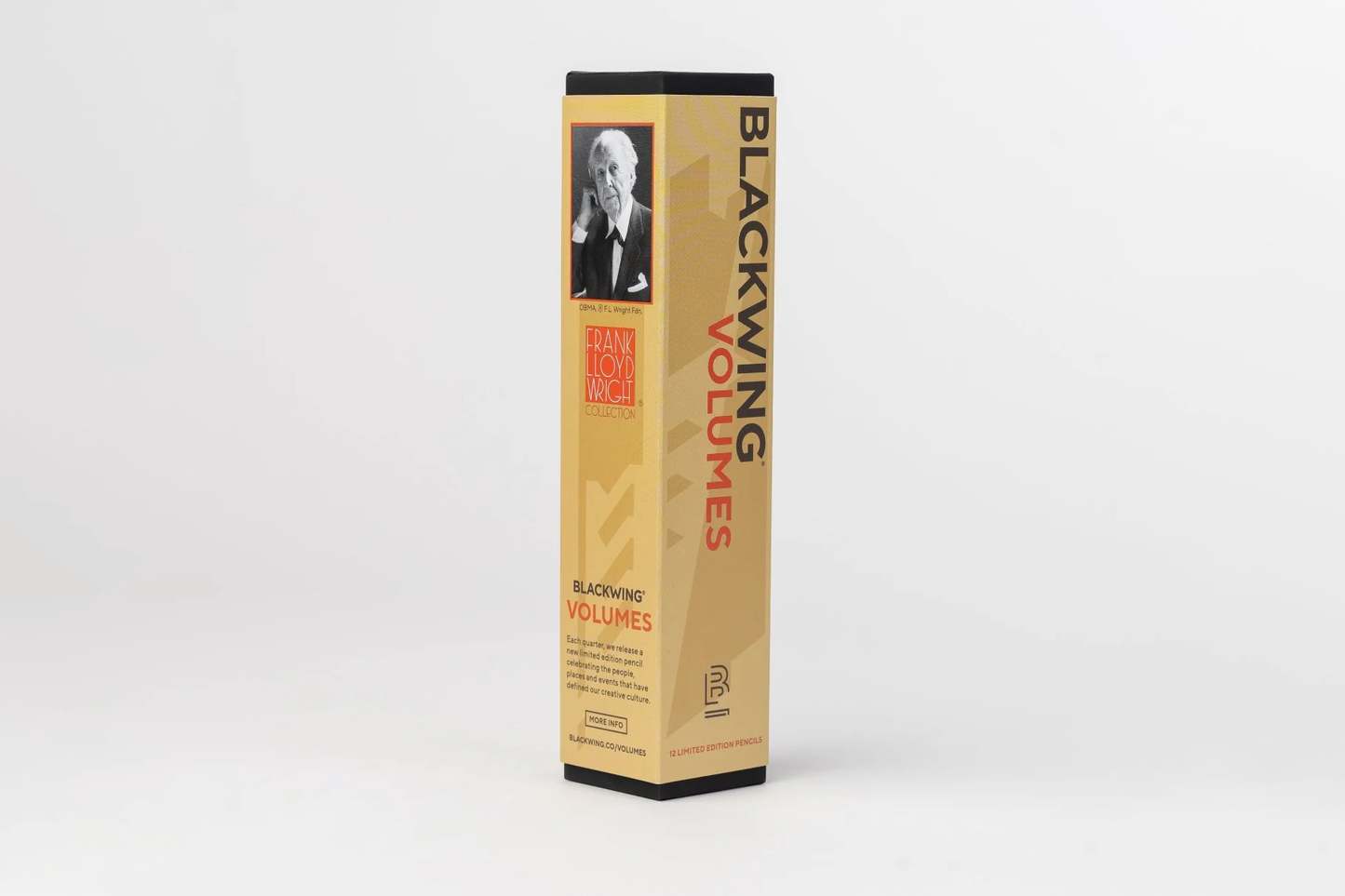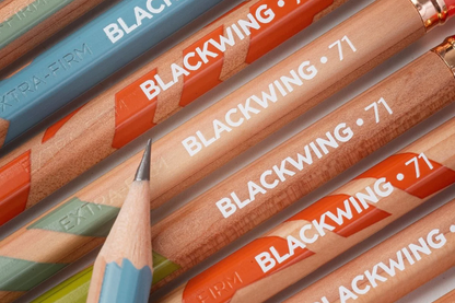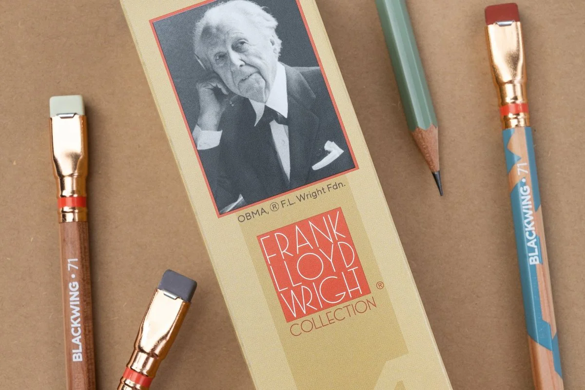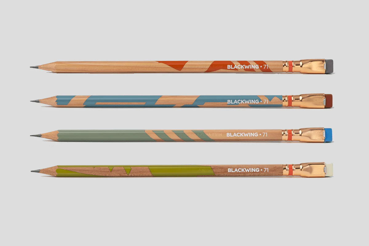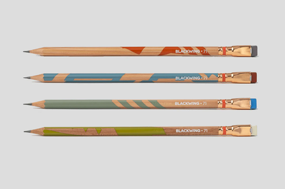The Blackwing 71 is a tribute to Frank Lloyd Wright and his architectural ambition. Each pencil features a silhouette of one of Wright’s iconic perforated boards printed in a muted, midcentury palette. The area around the board is unfilled, letting the natural wood of the pencil shine through. Each pencil also includes a copper ferrule and extra-firm graphite.