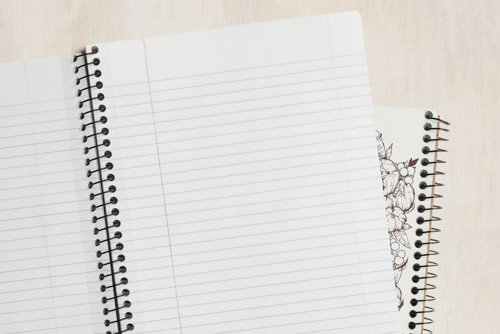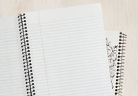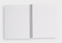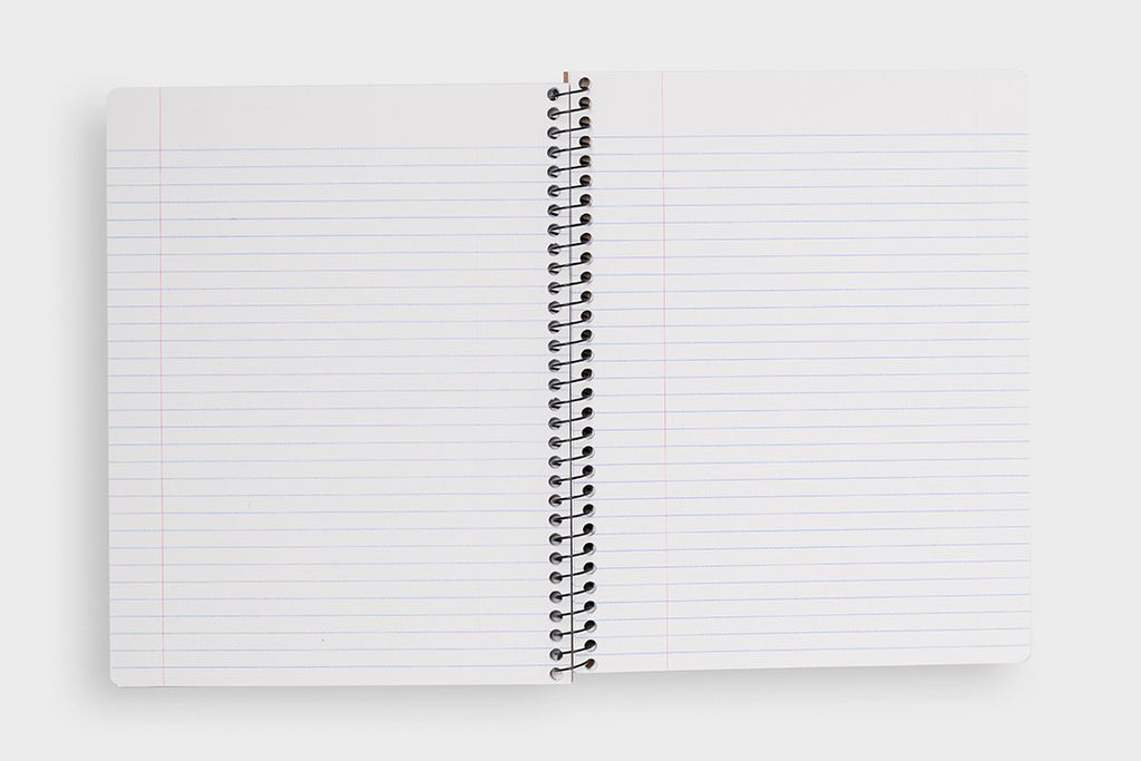 The large Decomposition Book features college-ruled paper - 7mm ruled lines printed in blue, with an adjacent margin in red. The hardcover notebooks have 160 ruled pages (80 sheets) of unbleached white paper made from 100% post-consumer waste. This new variation of notebooks from Decomposition are wire bound for even easier note taking! All 80 sheets are micro-perforated for easier and neat page removal. The covers are heavy card and, inside, feature all kinds of witty, useful information and sketches.