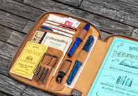 This folio fits a B6 notebook (sized 128 x 182mm, like this one), has 4 credit card holders, and 2 sleeves for storing small notebooks or receipts. This beautiful folio also has a pen holder, and 2 elastic slots for shorter pens or other small accessories. It makes a great bullet journal cover too!