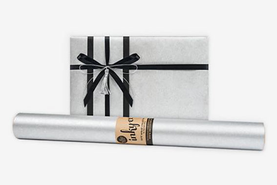 Silver Kraft is perfect for trend conscious wrappers who care for our environment. Printed with silver ink on unbleached brown kraft wrapping paper.