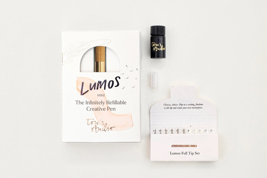 A precision engineered, The Lumos Mini from Tom's Studio is a beautiful and infinitely refillable fineliner, writing, and brush pen, including 9 professional artist's tips and 2 writing tips, all in a compact, pocket-friendly package.