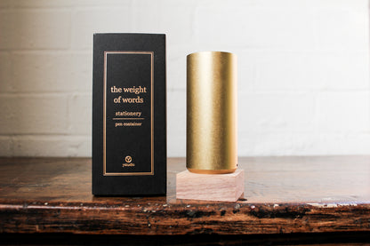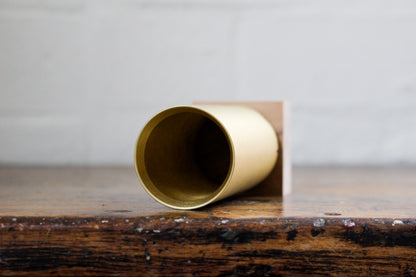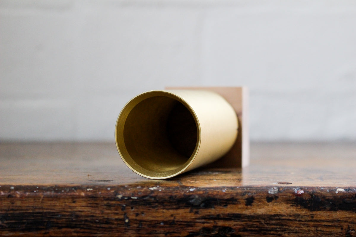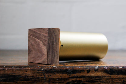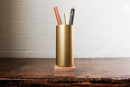 Cut from a brass cylinder with a hand-made walnut base, this pen container has a simple and clean look. Use it to store all of your different pens and accessories.